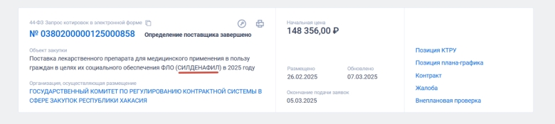 На сайте госзакупок появился интересный аукцион на поставку 720 таблеток СИЛДЕНАФИЛА. Начальная максимальная цена контракта 148 тысяч рублей. В результате торгов цену удалось снизить, итоговая сумма контракта составила 147тысяч рублей.