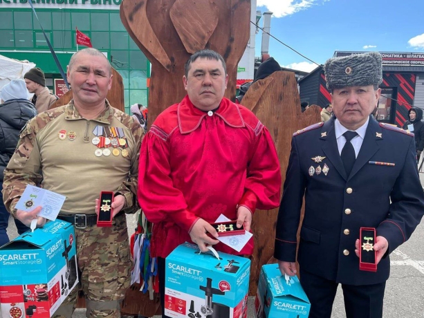 Нагрудный знак из рук Председателя Республиканского Совета старейшин хакасского народа Петра Воронина получил прапорщик милиции в отставке Алексей Саражаков.