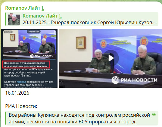 Данная информация является не просто не соответствующей действительности, а даже и рядом не соотносится с действительной обстановкой на земле. <…> Более того, фактически Купянск не был под нашим контролем ни одного дня. Командование ГрВ "Запад" просто безосновательно "закрашивает" территории. <…> Последствия ложных докладов – отсутствие достаточных мер противодействия проводимому на участке наступлению противника. И как следствие – занятие противником ранее контролируемых нами участков.