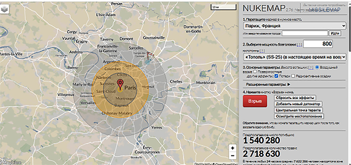 Удар по Парижу ведёт к гибели 1,5 млн человек и ранению 2,7 млн. Источник: nuclearsecrecy.com/nukemap (автоперевод)