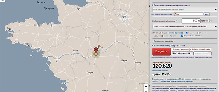 На этом примере гипотетического удара по Туру видно, что даже в такой густонаселённой стране, как Франция, нанесение ударов по военной инфраструктуре не ведёт к большим жертвам среди мирного населения. Источник: nuclearsecrecy.com/nukemap (автоперевод)