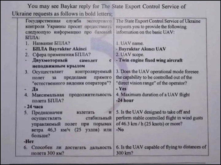 Ответы турецкой компании "Байкар" на запрос "Мотор Сич" относительно производимых ею БПЛА. В п.9 задаётся вопрос: "Имеется ли система/механизм распыления аэрозолей ёмкостью свыше 20 литров?" Фото: Официальный сайт МИД РФ