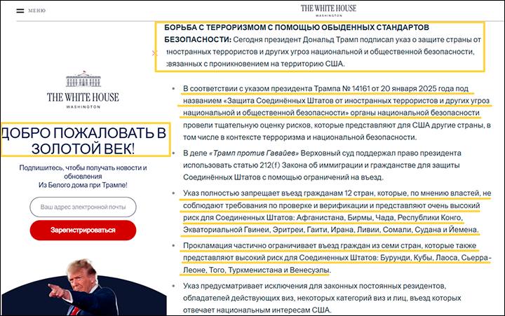 Кстати, вот вам ещё одно подтверждение – как версия – того, что Дональд Трамп под маской миротворца и политика, стремящегося навести порядок в собственной стране, готовился к атаке на Иран заранее. Вспомните – одним из первых его действий было ужесточение пограничного режима с Мексикой, из которой в подавляющем большинстве своём и попадали в США нелегалы, в том числе радикально настроенные. А теперь этого нет. И вот это давление на Мехико по поводу наркокартелей – возможно, тоже часть той же самой игры. Добавьте к этому массовую депортацию незаконных мигрантов из США (благое дело, к слову, в принципе-то) и запрет ещё с прошлого года на въезд гражданам из 12 стран. А теперь посмотрите, каких: