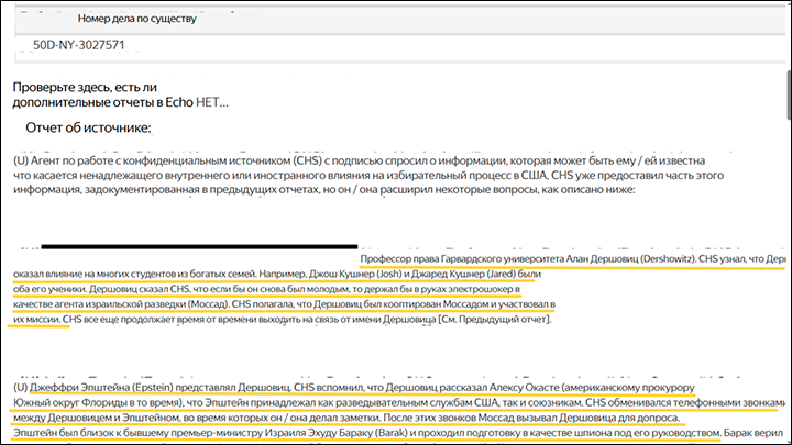 В документах фигурируют поистине сенсационные показания анонимного свидетеля ФБР. Он прямо утверждает: Трамп был "скомпрометирован Израилем", а его зять Джаред Кушнер является "настоящим мозгом его организации и президентства" и работает на израильскую разведку "Моссад". Свидетель даже назвал механизм вербовки: якобы Кушнеры были завербованы ещё в Гарварде профессором Аланом Дершовицем.