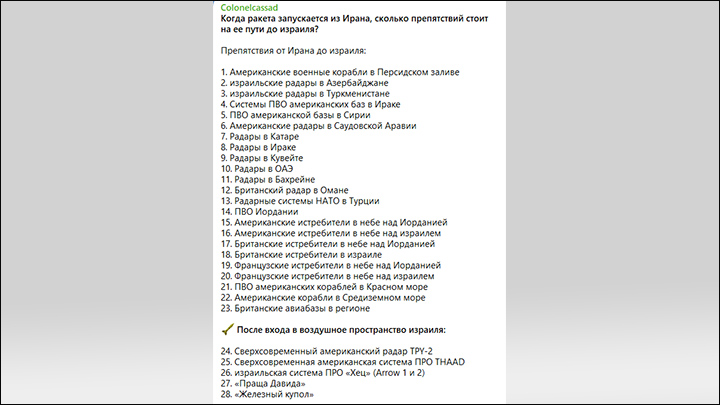 ТГ-канал Colonelcassad составил вот такую примечательную таблицу преодоления "самой масштабной, дорогостоящей… плотной системы противовоздушной и противоракетной обороны в мире":