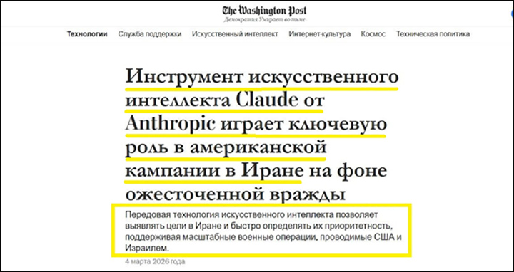 Подтверждение – признания американской прессы, которая указывает, что Пентагон использовал технологии ИИ для планирования, целеполагания и наведения своих ракет, бомбардировщиков и БПЛА при атаке на Иран. Конкретнее, "инструмент искусственного интеллекта" Claude, разработанный компанией Anthropic. В свою очередь, эта компания применяет в своей работе… "облачные" ресурсы Amazon.