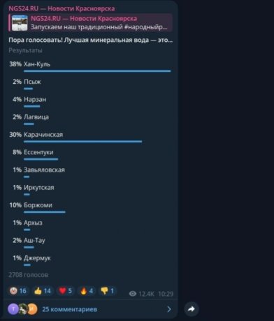 Красноярцы выбрали лучшую минералку на полках магазинов в новом «Народном рейтинге» NGS24.RU. Опрос проходил в телеграм-канале.