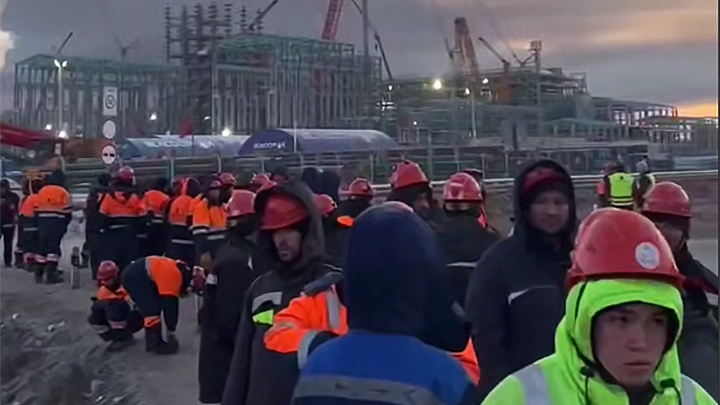 Рабочие-мигранты показывают последствия третьего за неделю налёта украинских дронов-"камикадзе" на порт Усть-Луга. Скриншот видеокадра: соцсети