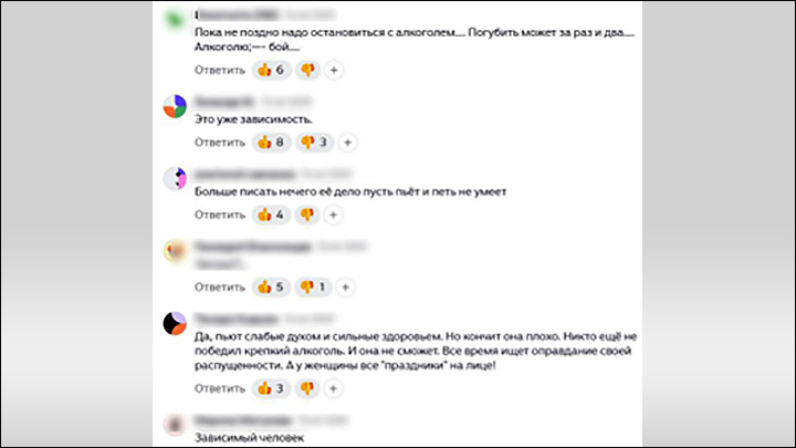 "Талантливая девушка в прошлом... Есть много заслуг в нынешнее время... Печально, что пьёт. А некоторые пользуются этим... Видок тот ещё... Жаль конечно..."