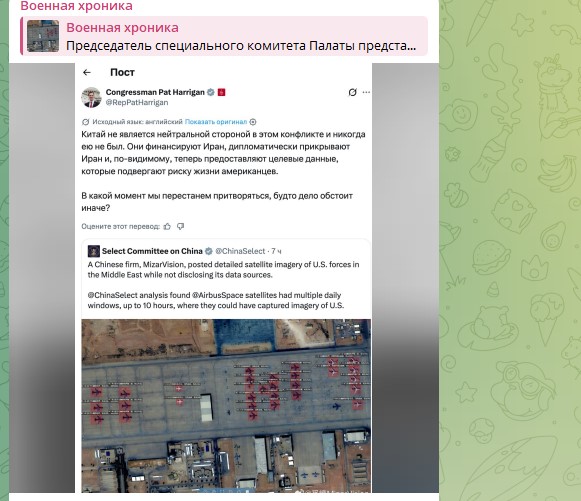 Стоит отметить, что американский политикум тут же "взорвался", мол, "так нечестно!", ведь в эту игру США собирались играть единолично. Использование Китаем европейских снимков американских баз США на Ближнем Востоке и последующий анализ их с помощью искусственного интеллекта на предмет всех находящихся там типов техники на стоянках авиабаз, по мнению властей США - недопустимо. Американцы, в частности, конгрессмен Пэт Хэрриган, утверждают, что "Китай не является нейтральной стороной в этом конфликте и никогда ей не был".