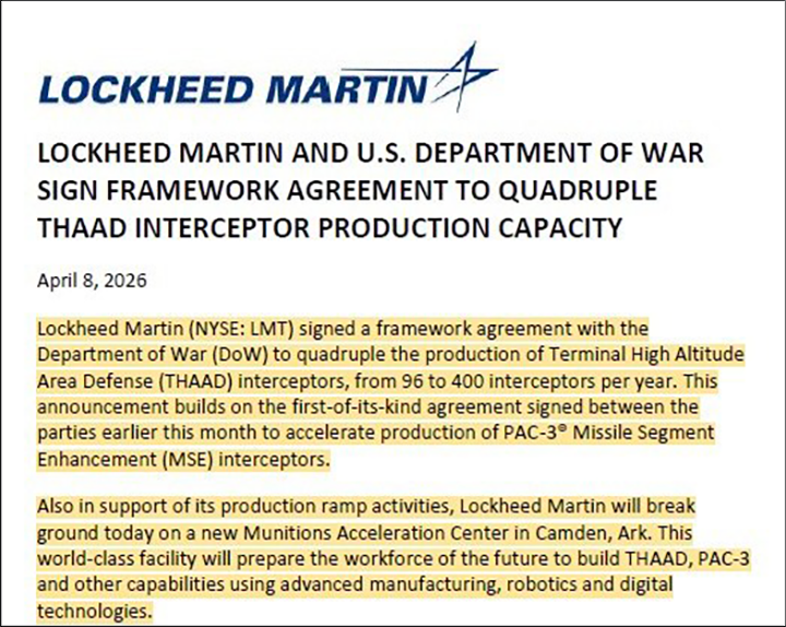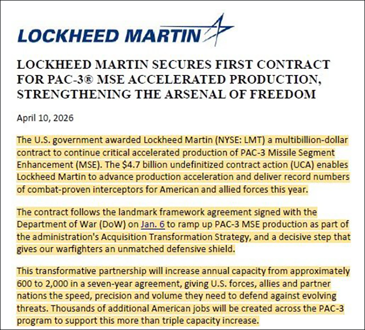 Так Lockheed Martin совместно с Boeing подписали с правительством США контракт на сумму в 4,7 миллиарда долларов и обязались увеличить ежегодное производство ракет PAC-3 MSE для системы ПВО Patriot с 600 до 2000 боеголовок (рост в 3,3 раза). Финализированный отчет о контракте был опубликован 10 апреля.