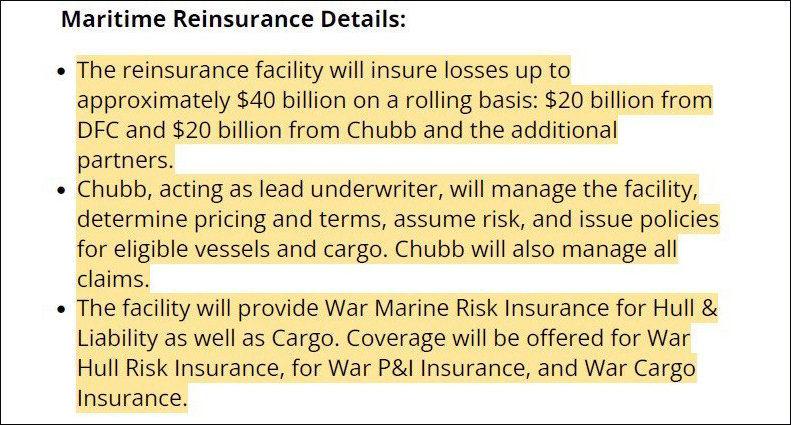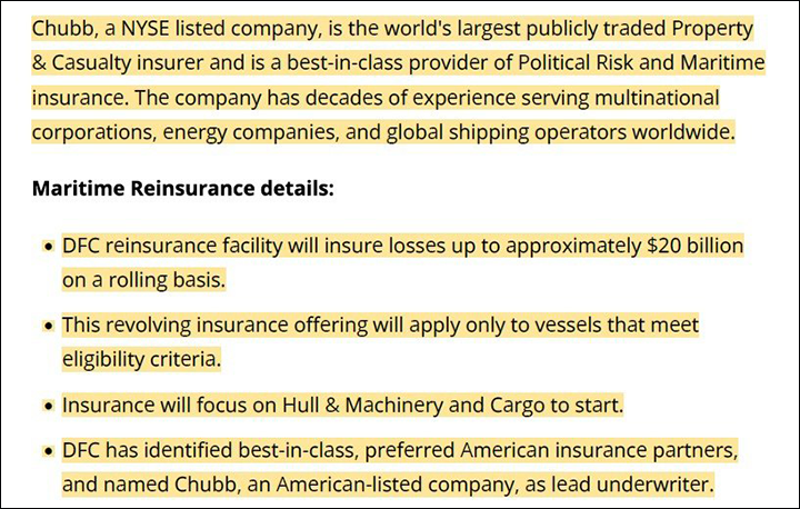 12 марта корпорация публикует "План морского перестрахования" (Maritime Reinsurance Plan). В частности, там говорится, что "перестраховочная программа DFC будет дополнительно страховать убытки в размере до 20 миллиардов долларов на постоянной основе", а также что "DFC определила лучших в своем классе предпочтительных американских страховых партнеров и назначила американскую компанию Chubb, акции которой котируются на бирже, ведущим страховщиком".