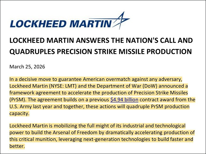 Наконец, снова Lockheed Martin (теперь уже самостоятельно) обязалась увеличить ежегодное производство тактических баллистических ракет PrSM (Precision Strike Missile) в четыре раза. За что компания получит 4,96 миллиарда.