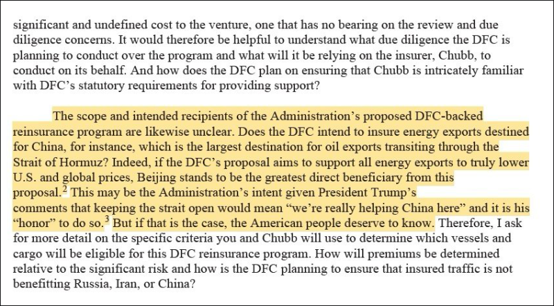 Сенатор-демократ от штата Нью-Гэмпшир Джинн Шейхин в письме на имя главы DFC Бена Блэка от 23 марта (письмо есть в распоряжении Царьграда) утверждает: "Действительно, если предложение DFC направлено на поддержку всего экспорта энергоносителей для реального снижения цен в США и на мировом рынке, то Пекин станет главным прямым бенефициаром этого предложения".