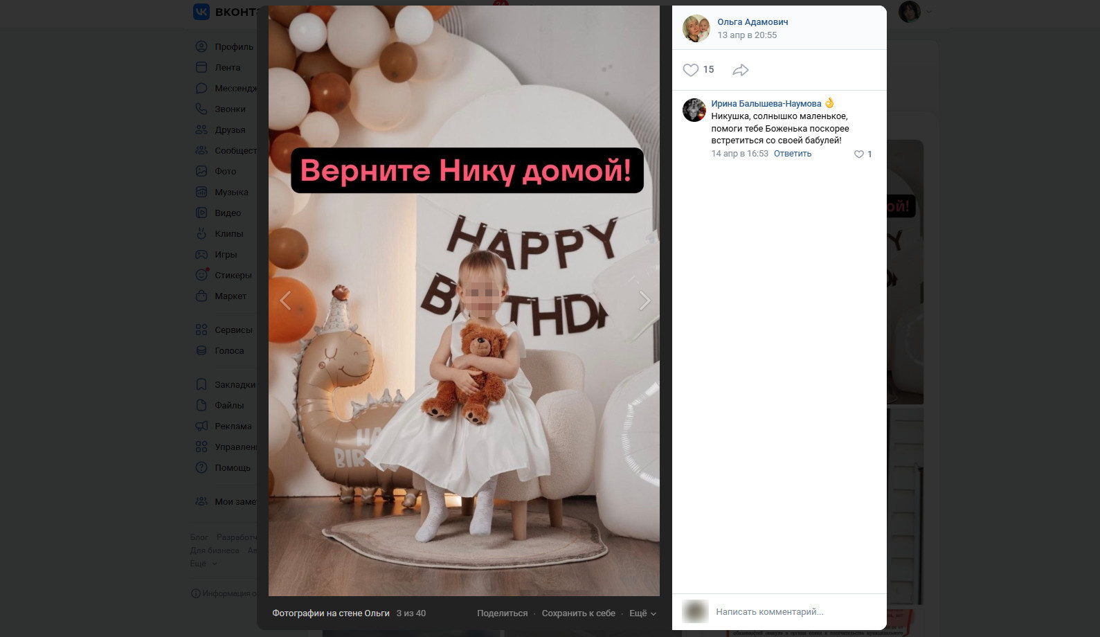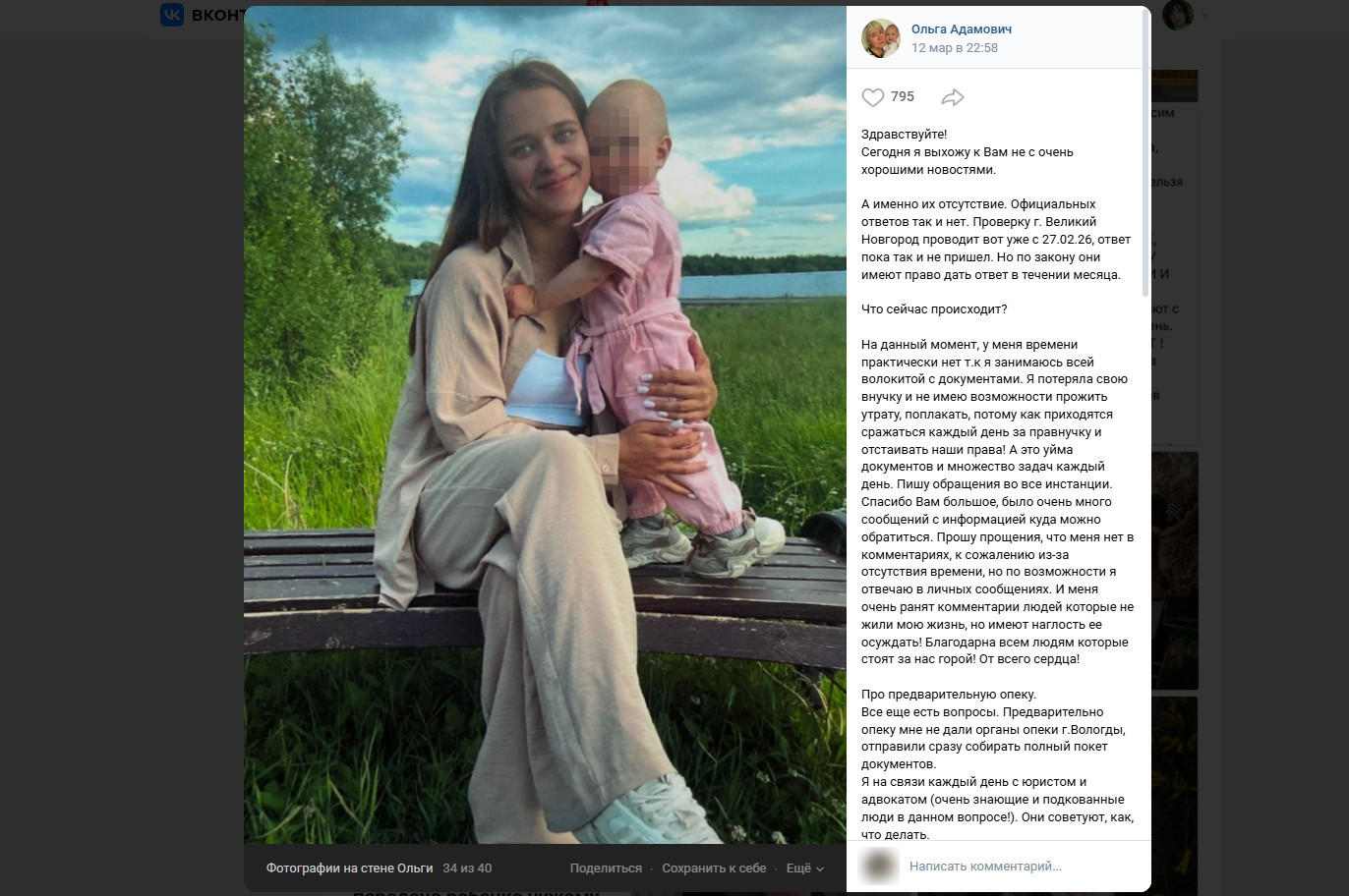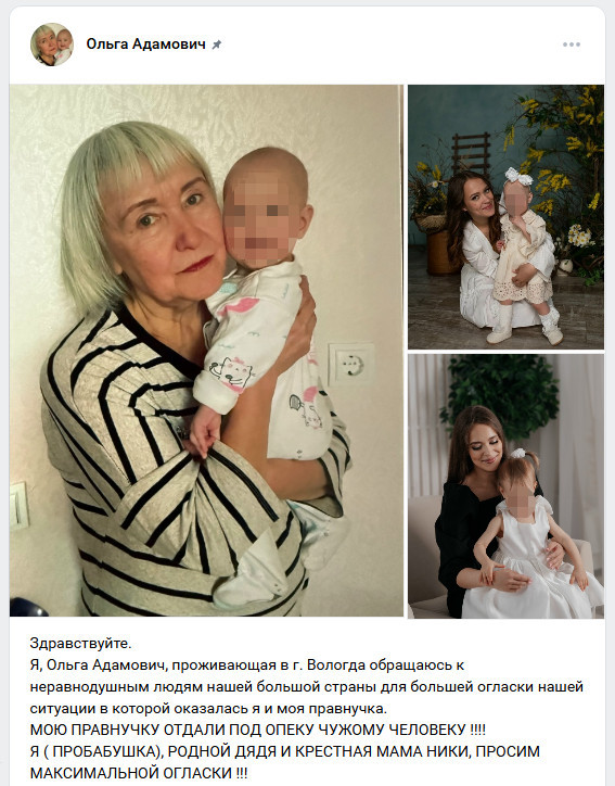 “Есть определённый вопрос также и к органам опеки и попечительства города Вологды (город, где живёт Ольга Адамович. – Ред.), которые имели с прабабушкой, скажем так, сложные взаимоотношения, поскольку бабушка в своё время была опекуном мамы Ники и её младшего брата. Но тогда бабушка самостоятельно, без помощи адвокатов всё оспорила в судебном порядке, прошла несколько инстанций. А обида какая-то видимо, у вологодской опеки осталась,”