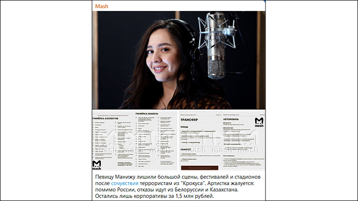 Манижу "отменяли", но сейчас, видимо, для неё настала "оттепель". Скриншот: ТГ-канал Mash