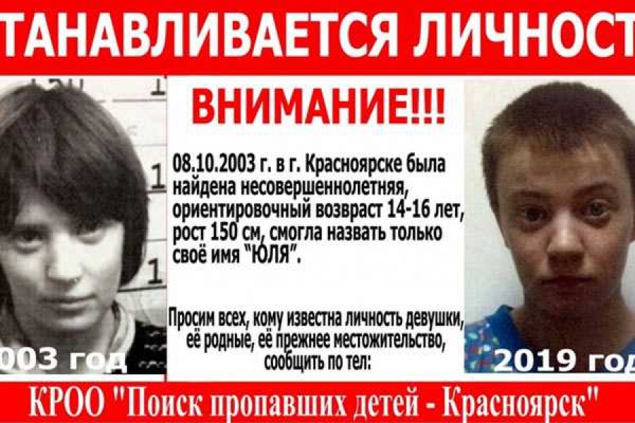 8 сентября 2003 года девочку по имени Юля нашли в Красноярске около одного из магазинов. Напуганная 16-летняя девочка стояла у витрины и не могла ответить, откуда она и где ее родные.