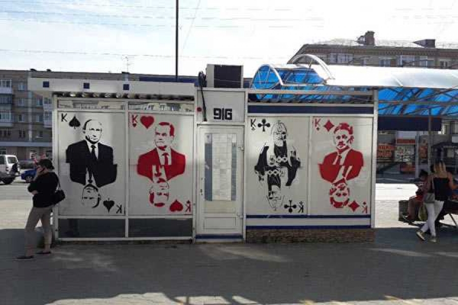 В Каменске-Уральском уличные художники нарисовали на автобусной остановке игральные карты с портретами людей, похожих на президента Владимира Путина, его пресс-секретаря Дмитрия Пескова, премьера Дмитрия Медведева и патриарха Кирилла. Информация об этом появилась на страничке группы «Подслушано Каменск-Уральский» в соцсети «ВКонтакте».