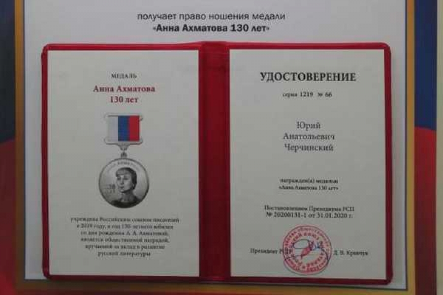 Педагог дополнительного образования МБУ ДО «Центр детского творчества» города Абакана, член Союза писателей России Юрий Анатольевич Черчинский награждён медалью «Анна Ахматова». Награда присуждена за вклад в развитие русской литературы.